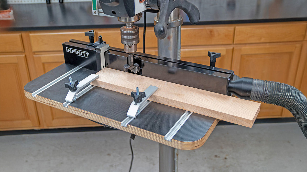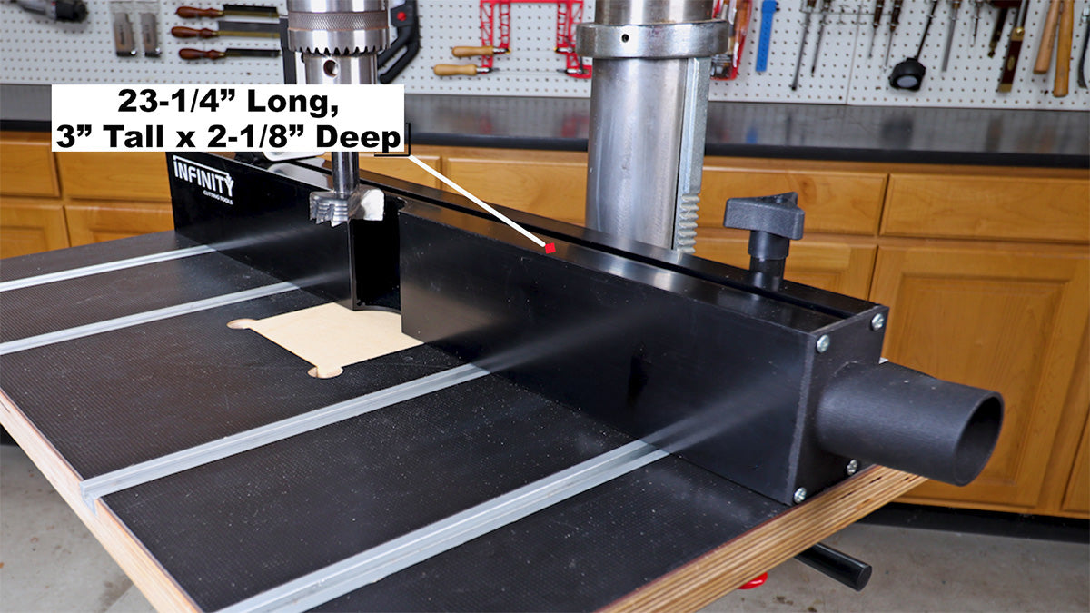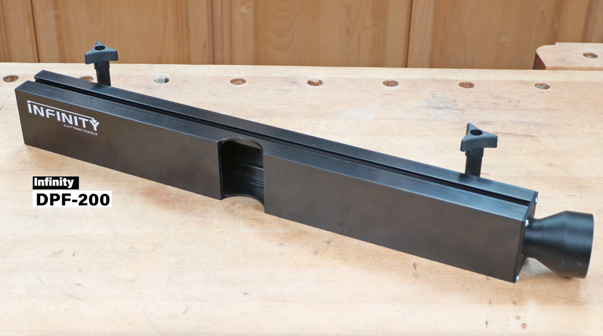 The NEW Infinity Tools Professional Drill Press Table and Fence (DPT-200) is an upgrade in every way. Larger to better support your work, easily located, T-tracks for adding stops and best of all – dust collection! Through-the-fence dust collection easily connects to your dust collector and pulls dust and debris away from your work to keep things tidy and visible!