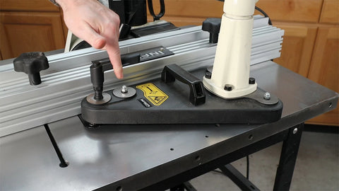 With the Lifting Foot extended and the magnetic bond broken, the magnetic base and power feeder can then be lifted off the machine using the center Lifting Handle. We don't recommend lifting by the Lift Assist Knob due to the weight of the combined unit.