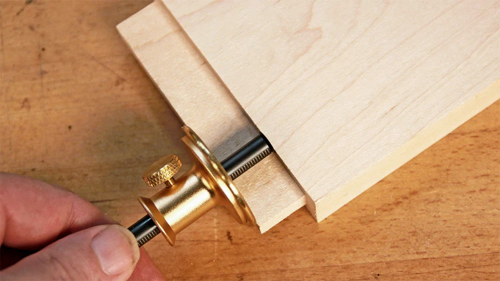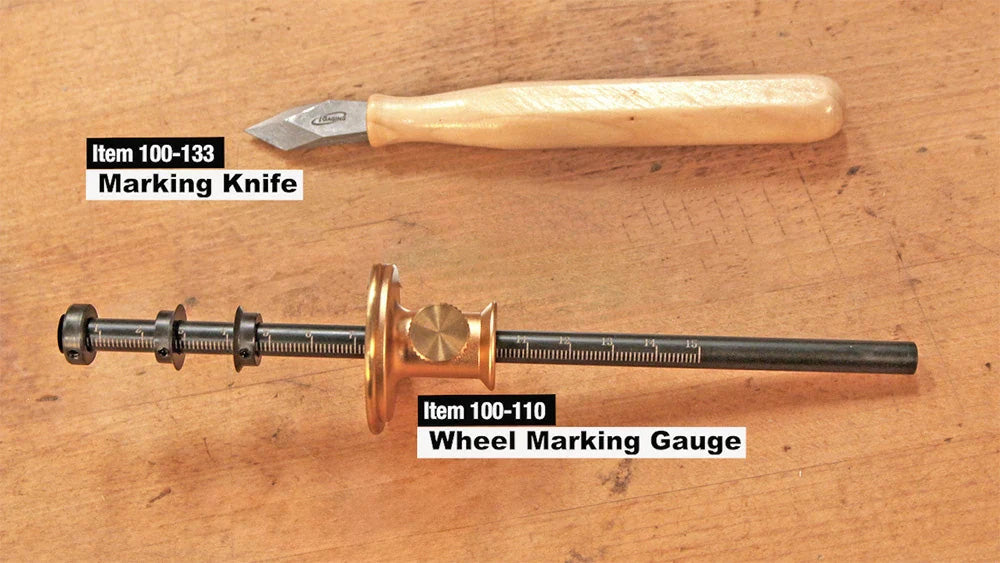 We're going to call this a two-fer as these two hand tools work so well together. At the bottom of the image is a wheel marking gauge. The marking gauge includes cutters to lay out both sides of a mortise in one pass. Or set it with a single end cutter to transfer and mark a half-lap joint.