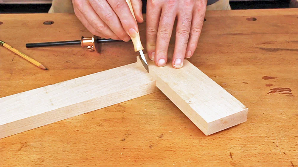 The other item in our duo is our Precision Marking Knife. This marking knife has a comfortable 5" long hardwood handle for all-day use. Made for either left or right-hand use, marking knives are great for layout work in your shop because they're many times more accurate than thicker pencil lines. But the advantage of scribing doesn't end there; a scribed line pre-scores your wood, making final cuts with your hand or power tools more crisp and clean by eliminating unsightly tearout.