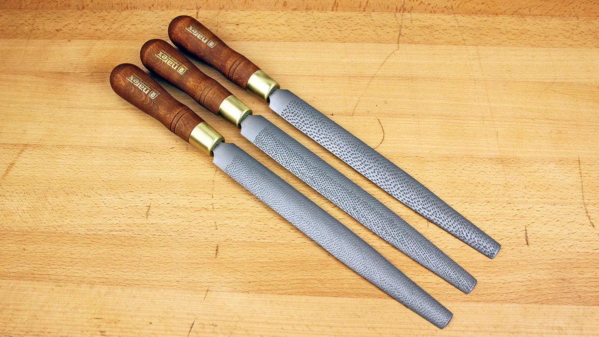 Lastly, but very important, is smoothing things out after cutting. Hand stitched rasps produce a slightly irregular tooth pattern that cuts faster and leaves a smoother surface than an equivalent machine cut rasp, making them highly sought after by professional furniture and instrument makers. The Narex Cabinet Rasps feature hand stitched teeth with three levels of coarseness; coarse, medium and fine as measured in tooth count per square centimeter. Each rasp measures roughly 16” overall including the hornbeam wood handle. The 1” x 10” body cuts on both the flat and convex faces allowing flat, concave, and convex surfaces to be shaped.