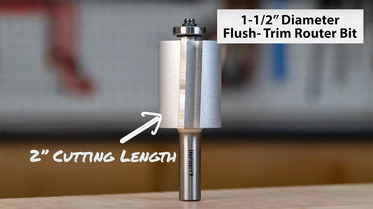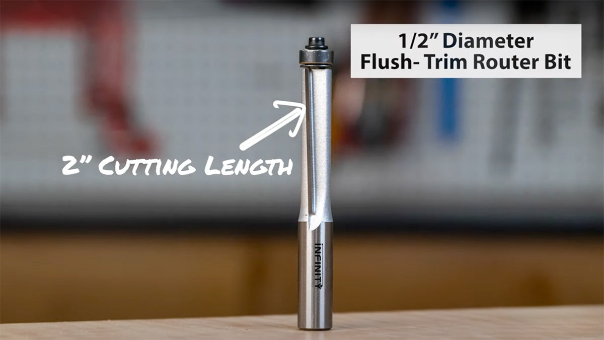 The ½” diameter flush-trim bit (06-629) has a 2” cutting length, capable of following templates in thick stock.